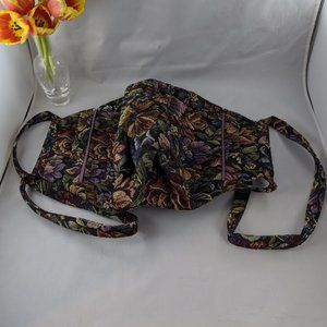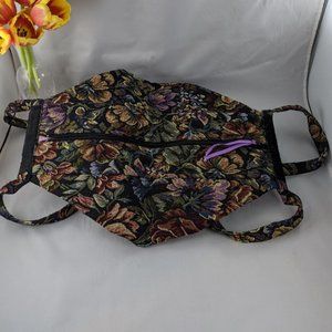 Vintage Hand Made Folding Velcro Zip Shoulder Bag. Folded=14" x 9". Open=14"x 17". Double Handles Measure 28". Handmade by Mary Klus. Heavy Duty Outer Fabric, soft cotton liner. 2 Ink stains on interior. Zipper closure, and then folds in half and velcros shut. 2 exterior open pockets and 2 interior open pockets.