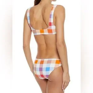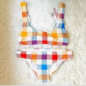 Reposhing this item I purchased from @silgert - SO CUTE, but alas the top is not accommodating enough for my bewbs 😣 Matching bikini top and brief set 💜 Multi-colored buffalo check / gingham pattern. Stretch-nylon, fully lined. BRAND NEW with tags and original lining!!!
