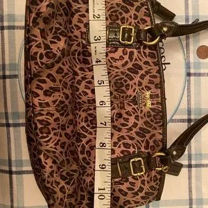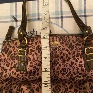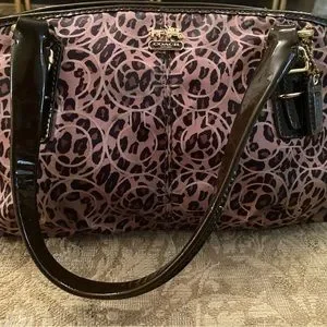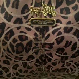 Gently Used Coach Brown Leopard Print Bag Beautiful Lavender Inside. One slip pocket. See pictures for approximate measurements.