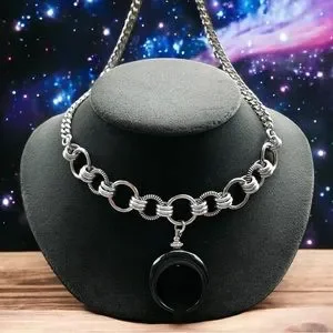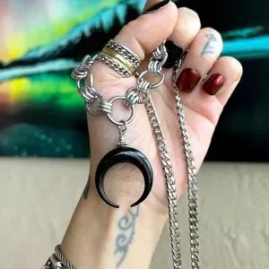 Handmade maille stainless steel necklace cuban chain with black buffalo horn up side down crescent moon lunula charm . Chain is adjutable 15 to 17.5 inch long . ( If you need a different size lmk ) Maille hoops are stainless steel and aluminium material . Aluminium is like stainless steel it is is nickel free , allergy free , hypoallergenic , no itching , do not change color Tags : boho / #bohemian / bohochic / goth /#natural healing stones & crystals / gem / gems / #gemstones / #gothic / victorian / queen / medieval / viking / celt / celtic / fairy / rock & roll / Rocker / rock chic / biker / gift / Stylish / antique look / trendy / festival / cable & hoops chains / #chokers silver necklaces / luxury / casual / every day jewelry / patterns / night out / date night / going out / party / clubbing / medieval fair / renaissance / elegant / dainty / chic / emo / punk / pin up / rockabilly / edgy / cute / thick chains / moon child / moon phase / crystals / horns / lunula / witch / viking