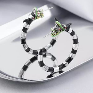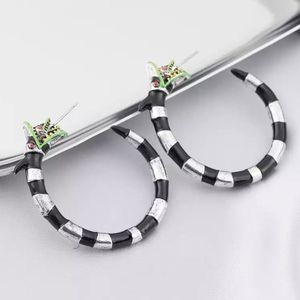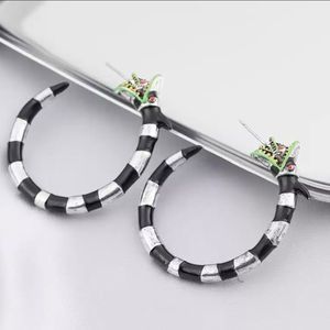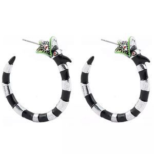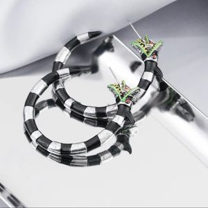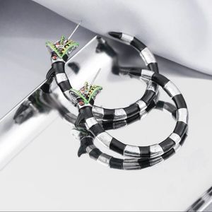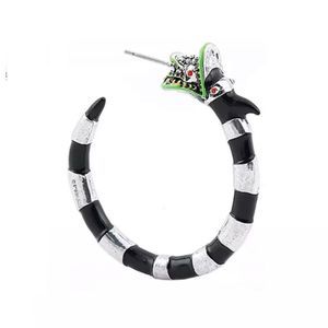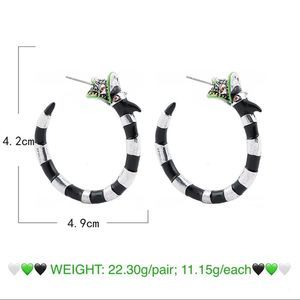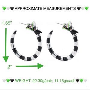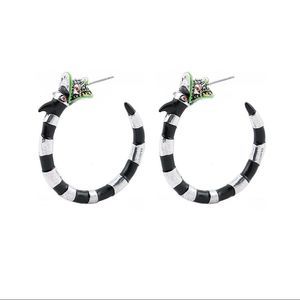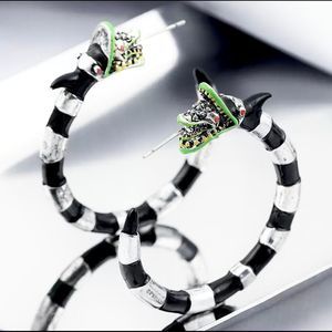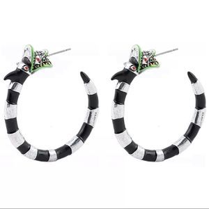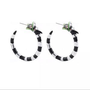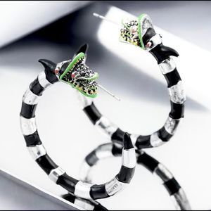 • Black & (White) Silver Striped Hoop Earrings with hand painted “Sand Worm” Double Head Detail in red & green enamel biting at your ears!