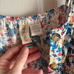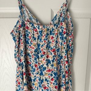 Mimi Chica floral midi dress, size small. Cream base with dainty blue, red, and gold flowers. Buttons all the way down, they do work, not just for show. Tue front under the bust. Adjustable straps. Excellent condition, smoke-free home, fast shipping.