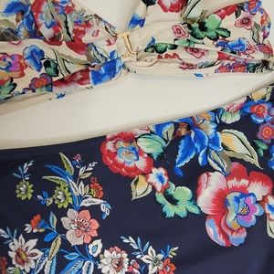 Johnny Was Maya, twist top and high-rise bikini bottoms in a navy blue and ivory floral print. JW makes fabulous swimwear. I searched and searched last summer and this season. I bought this small and the top is just a little too small. Then I lucked onto a large. Now, I am happy! This small set is NWT. I paid full price and am hoping to recoup, especially now that I have two.