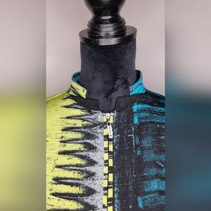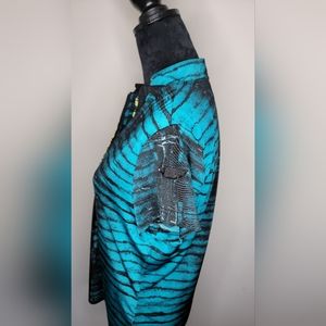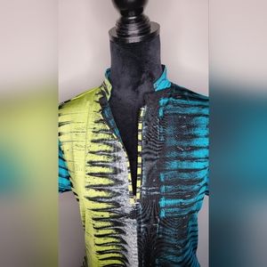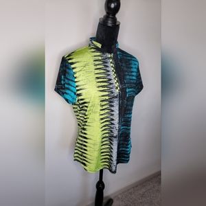 It's made out of very soft , breathable material 95% polyester 5% Spandex with a modified mandarin collar and bold pattern all around.