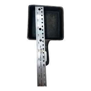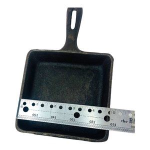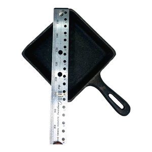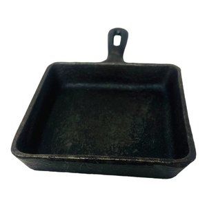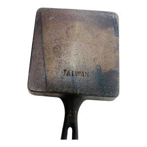 Small square cast iron skillet made in Taiwan. Pan is in very good condition with some rust on the bottom and may need conditioning.
