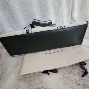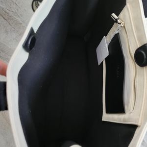 Brand new with tags. An OTG (on-the-go) large tote bag by Ted Baker. Canvas, roomy beige material made with dual shoulder handle. Snap magnetic closure with one zip pocket. Dustbag included.