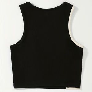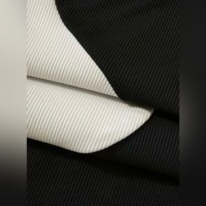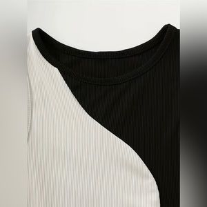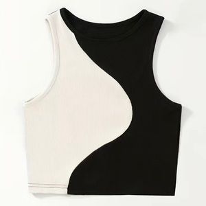 Keywords: color block, two tone, black and white, rib knit, crop top, Y2K, groovy, 70s, abstract, curve, yin Yang, hipster, party, art, 90s, 2000, lightweight, cropped shirt, solid colors, 00s, hippie, spring, beachy, pool side, sunny days, waves, opposites attract