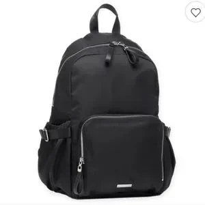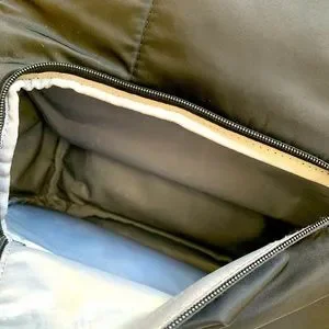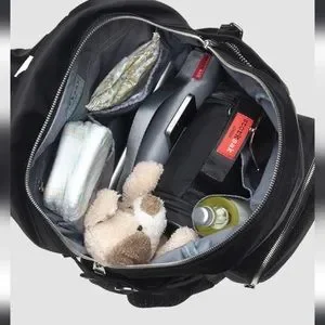 Diaper and kids gear backpack, but also great as a normal backpack. Comes with insulated snack bag and diaper changing mat. Has Velcro divider to give option of one large area or two smaller sections - section below has access via a zipper in the back, pictured; good for wet clothes, picnic mats, food/bottles, shoes.