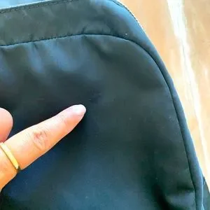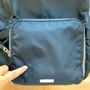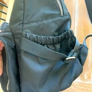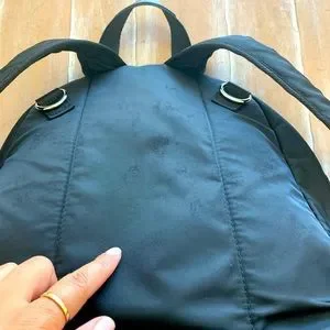 Good used condition, see photos of scuffs/marks. Black nylon backpack with silver/chrome zippers.