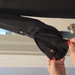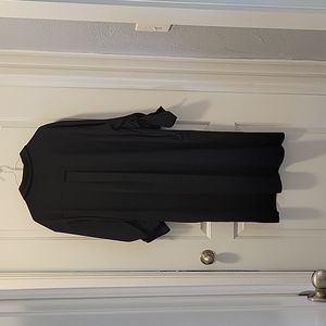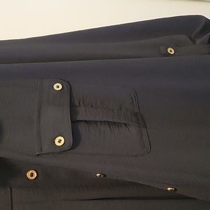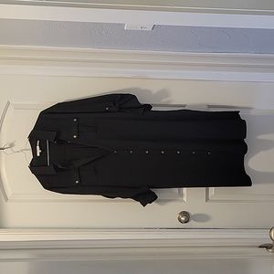 Calvin Klein black, long sleeve, shirt dress, polyester, gold buttons, pockets, breast and side, no tears, no stains, smoke-free, pet-free home. Worn only one time. Machine wash, cool iron if needed.