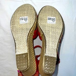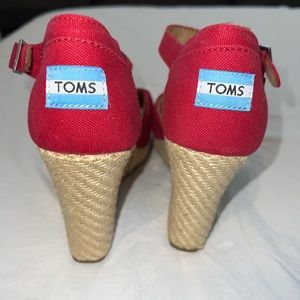Brand New, never worn, no tags. Red wedge heels by Toms. These are listed as 8.5W but they do not fit wide, which is why I have never worn them. Heel is approx 3.5 inches high. Super fun summer staple!