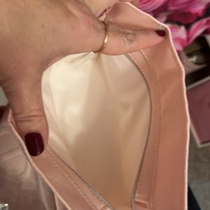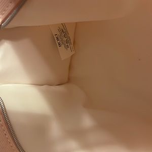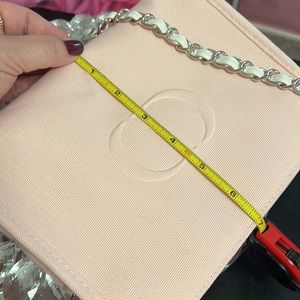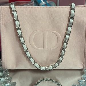 Beautiful soft pink bag from Dior Beauty. Nice size for wallet-keys-iPhone. I attached a 47 inch white and silver braided chain, so it can be carried as a crossbody or shoulder bag. Good quality with a silver zipper across the top for extra security. 8.5 in across X 7 tall.