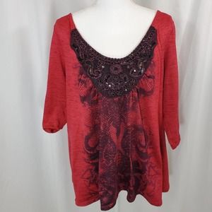 Live and Let Live Woman Red & Black Beaded T-shirt Sz 2X