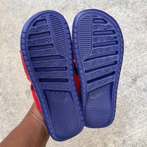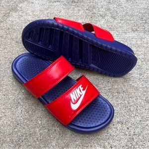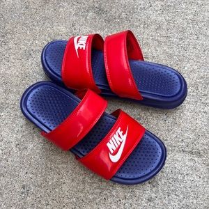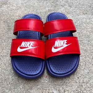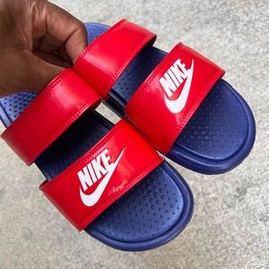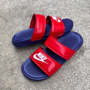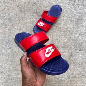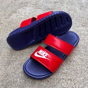 WMNS BENASSI DUO ULTRA SLIDES PATENT REDS BLUES ROYALS