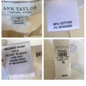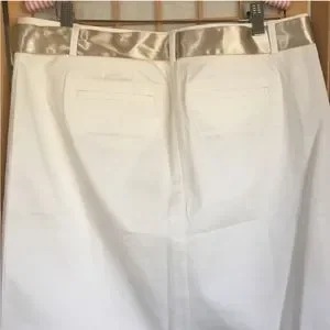 Ann Taylor Factory Midi Cream Skirt…front button/zip/slide clasp closure…removable gold sash…two faux back pockets…approximate measurements…waist 17”…length 22 1/2”…SZ 14..NWT…questions always welcomed