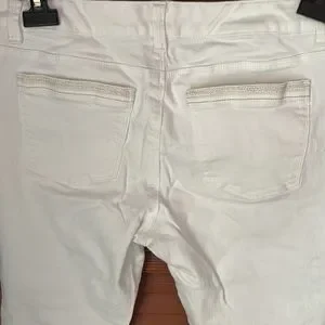 White House Black Market white ankle pant size 8 with gold thread detail on back pockets and gold zipper at ankles