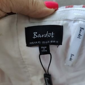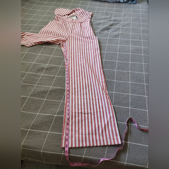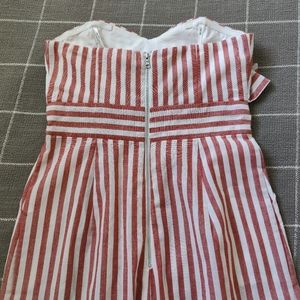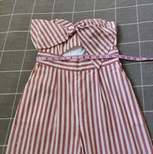Cute red stripe summer jumpsuit from Bardot. Strapless. Wide leg. Zipper on back. Has pockets! Condition is New with tag. Ladies size 6. See photos for measurements.