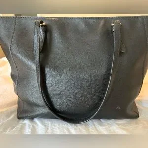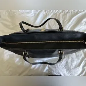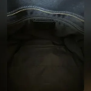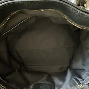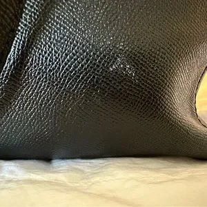 Textured/pebbled black leather with gold details. Used a handful of times. Slight signs of wear includes a few white scuffs that I think could be easily removed with leather cleaner (as noted in pictures). Has several pockets inside and one on the outside that locks.