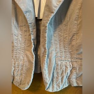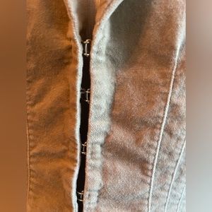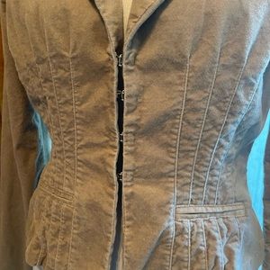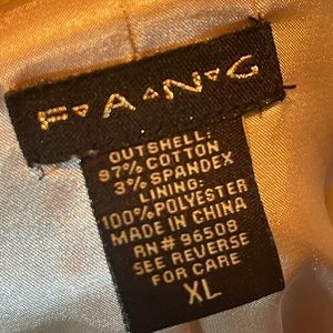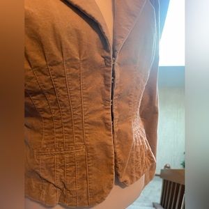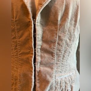 Vintage Y2K Cotton Velvet Fitted F.A.N.G Blazer Jacket Sz XL Lined Satin has stretch, no flaws, excellent condition. Size XL fits like a Large l. Light tan in color with satin lining. The jacket has awesome looking piping that almost looks like a corset in the back. The front has cool looking metal hook and eye closures.