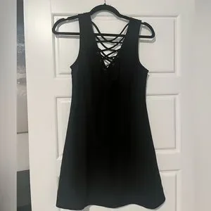 Cross cross back with zipper. Sleeveless summer dress. Cute flattering and forgiving. Tie lace up front. Wore once.