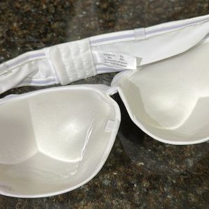 Really nice white strapless bra with padding and extra built in lift. Good condition. No brand name tag. It also has a place to add straps if you would like.