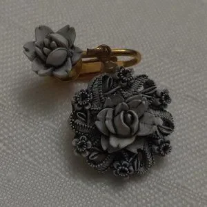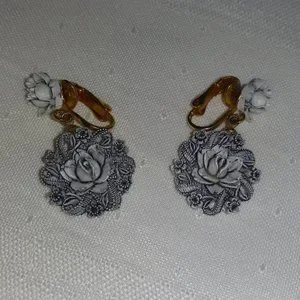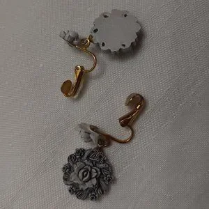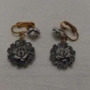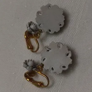 These are a vintage set of earrings made from molded celluloid. They have gold toned hinge style clip on backs.
