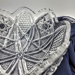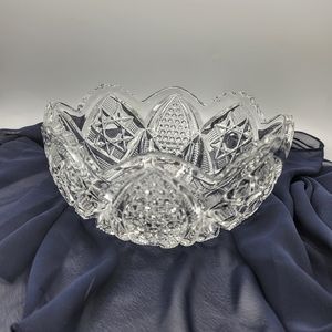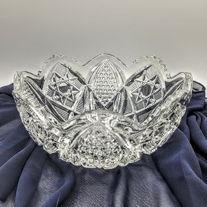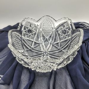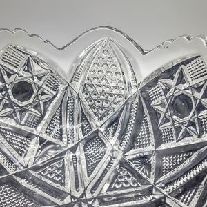 This antique bowl is a beautiful example of early American Brilliant Cut Glass. With its round shape, clear color, intricate hobstar pattern, and sawtooth edge, it is a stunning piece of decorative serveware that would elevate any collection. Made in the United States between 1900-1919 using traditional cut glass production methods, this vintage bowl is a rare find.