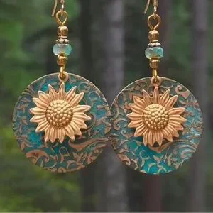 Infuse your look with a vibrant touch using these sunflower and turquoise earrings. The sunflower design radiates positivity, complemented by the turquoise and gold plate. This delightful pairing adds a natural and lively charm to your outfit.