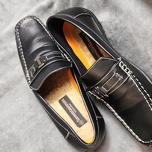 Saminto Laurenzini Men's Loafers styled in Italy. Size 10. Black with white stiching. Easy slip on and stylish. Branded label is embroidered, cork insoles for maximum comfort. Pre-owned in excellent condition.