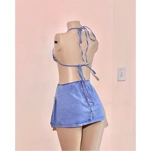 nadia rhinestone skirt set, 2 piece set, denim set, denim skirt, rhinestone set, denim skirt set, skirt set, y2k, rhinestones, bikini top, triangle top, tie waist top, crop to, halter top, mini skirt