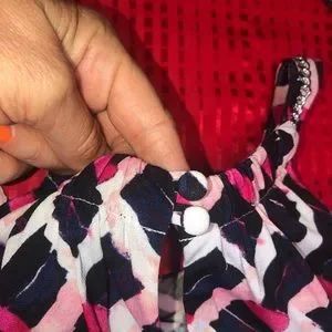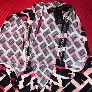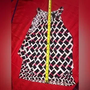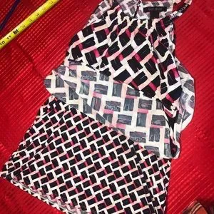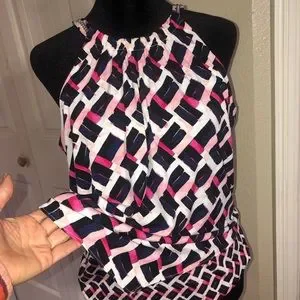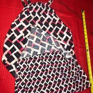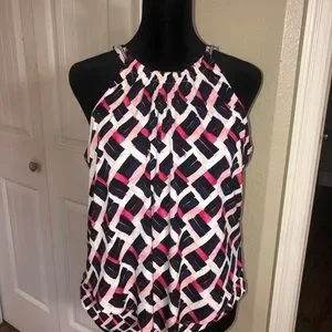 Pink, Black and white colorful top. Silver twist up on shoulder. Cute and bright sleeveless blouse