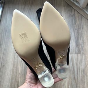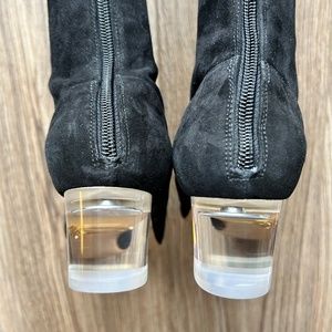New! Stunning black suede Charlotte Olympia boots. Sultry over-the-knee cut of a stunning suede boot crafted to ensure a perfect, non-slouchy fit. Clear lucite two-inch block heels. Pointed toes. Size 37.5.