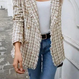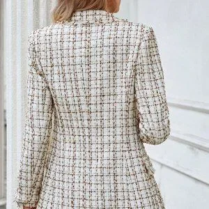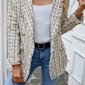 Multicolor Preppy Womens Plaid Pattern Raw Trim Lapel Collar Tweed Blazer