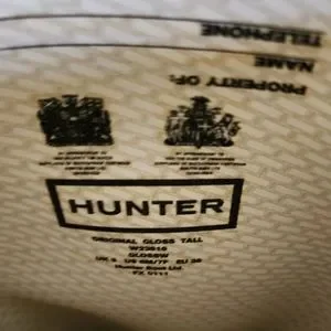 Tall Hunter rain boots. adjustable strap on calves.