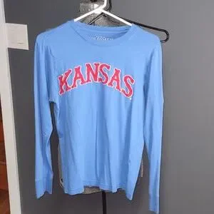 Women's small long sleeve T-shirt with patches seen on of "Kansas" and "Jayhawk" logo on sleeve. gently worn.