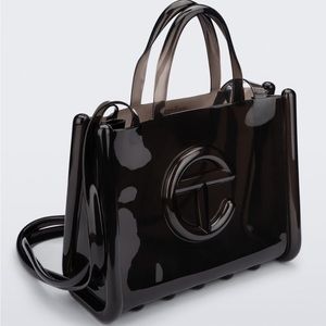 The medium Melissa x Telfar Jelly Shopper — featuring fluid design and tubular construction. This translucent shopper is completely water-resistant, making it an instant summer staple. Molded using Melissa's exclusive Melflex materials, it looks extra bomb with the matching slides.