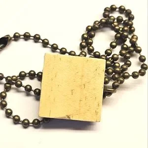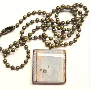 One of a kind blue and tan tile pendant. The pendant is on a bronze tone chain. The chain is 17" long. The tile is 3/4" x 3/4".