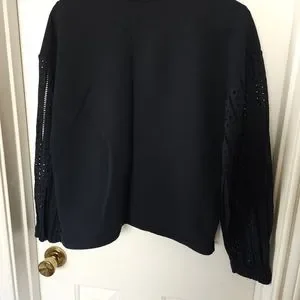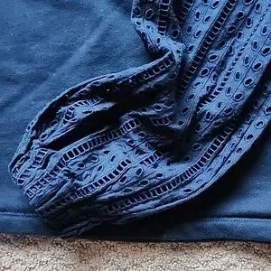 Deep navy color, soft jersey material with eyelet sleeves, great with skirt or your favorite pair of denim. Bust 19", length 21"