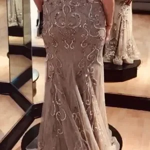 Beautiful mocha studded strapless gown with a mermaid shape and a horsetail train. Size 12