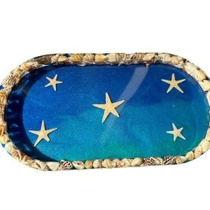 Oval shaped blue beach ocean theme resin trinket tray made with various shades of blue resin has starfish inside tray and sea shells around the edge. Approximately 7” long by 3.75” wide.