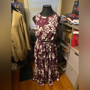 Purple sleeveless maxi dress with white floral design. Elastic waist with sash belt, keyhole back with 2 hook closure, lining under skirt. Excellent used condition. Lane Bryant size 18.