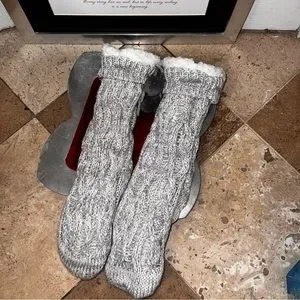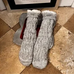 Cozy Gray/Cream Lined Slip On House/Lounge Slippers/Socks - Grip on Sole