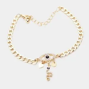 Brand new gold link chain charm bracelet designed with a shiny rhinestone evil eye charm and a snake charm
