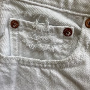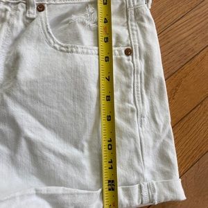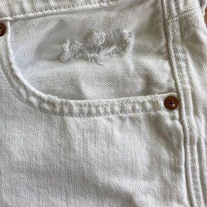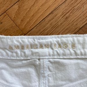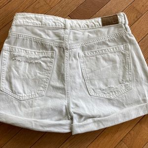These are in like new condition American Eagle white denim distressed shorts that fold on the bottom of the shorts . They have some great distressed marks on them not too over distressed ! They are a Great pair of white denim shorts ! Soft and comfy ! Measurements in the pictures!