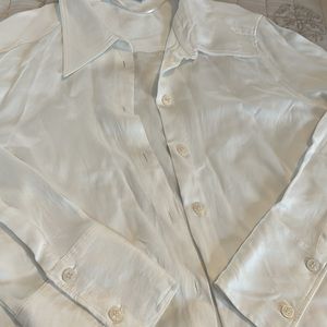 In good used condition one flaw on back but could come out just never tried to get it out 100% viscose material beautiful shirt still has lots of life left color is a creamy white