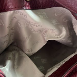 This cute red leather bag can be on your shoulder or as a crossbody. Extra back section w/ magnet and front pocket for little things. Main purse section has zipper with 4 pockets inside and zipper . Great condition!