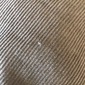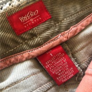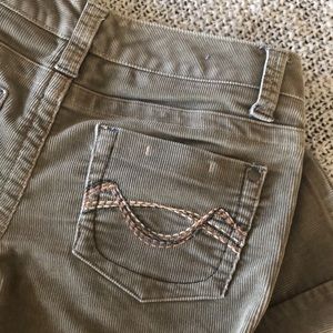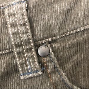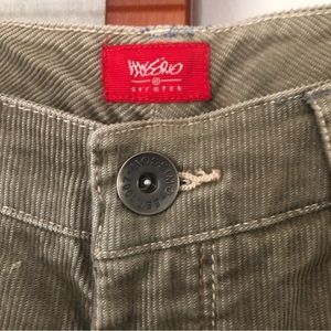 Vintage corduroy muted sage green flare bootcut pants, low rise, zipper button fly, belt loops, pale orange and blue contrast stitching. One mark and a few tiny pulls present.
