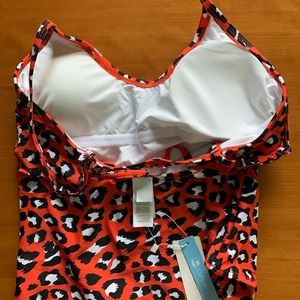 Cute, new bathing suit in orange, black and white leopard print. Removable padded shelf bra for extra support and adjustable straps. Fully lined for comfort. Size large on tags but fits a medium, size 4-6 best. Tags still attached. 🧡