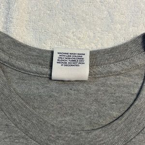 This preowned and gently used t-shirt is in very good condition. There are no rips, tears, stains or snags. It is a heavy gauge cotton/poly blend, gray with black graphics.