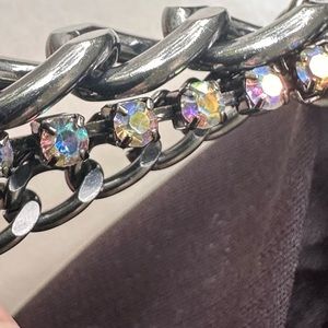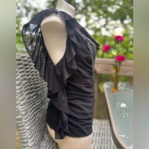 This is a true designer piece, not one of the less involved pieces from one of his many collaborations. Pure black gauzy poly fabric is designed to drape perfectly around your curves. The attached varieties of chains weight the drapes in order to give you the look you see in the photos. Gathered shoulders, ruffly flyaway sleeves.